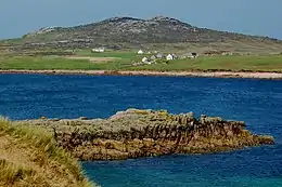 The island is around 120 hectares (300 acres)[3] in area. It lies off the Donegal coast near Kincasslagh.[2] The island's highest hill, Moylemore, has a summit elevation of 102 m.[4] The buildings of the island are located on its southern part, the northern part being rocky and exposed to winds. On Owey there is no mains electricity or public water supply.