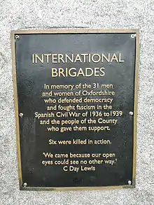 "In memory of the 31 men and women of Oxfordshire who defended democracy and fought fascism in the Spanish Civil War 1936–39 and the people of the County who gave them support. Six were killed in action."