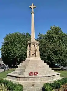 The eight faces of the plinth bear carvings within recessed niches. The south face has a carved shield bearing the inscription "IN / MEMORY / OF / THOSE WHO / FOUGHT AND/ THOSE WHO / FELL / 1914–1918". Later added to the second step is the inscription "AND / 1939 – 1945" and on the fourth step: "AND ALL OTHERS WHO HAVE GIVEN THEIR LIVES / IN THE SERVICE OF THEIR COUNTRY". The main inscription on the face of the memorial cross has become worn, and further inscriptions were added to the top step in 2016, adding "FOR THOSE WHO FOUGHT", "1914–1918", "AND THOSE WHO FELL".