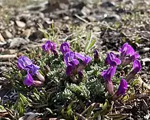 This plant is a matted, cushion-forming perennial herb with erect or prostrate stems just a few centimeters long. The leaves are up to 5 centimeters long and are each made up of several leaflets.[1] The herbage is coated in silvery gray hairs.[2] The inflorescence is a raceme of one or two purple or blue-violet flowers. Flowering occurs in June. The fruit is a papery, inflated, hairy, black legume pod up to 2.5 centimeters long.[1][2]