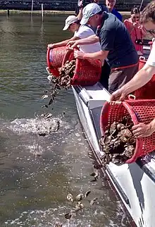 Oyster reef restoration refers to the reparation and reconstruction of degraded oyster reefs. Environmental changes, modern fishing practices,[1] over harvesting,[2] water pollution, and other factors, have resulted in damage, disease, and ultimately, a large decline in global population and prevalence of oyster habitats. Aside from ecological importance, oyster farming is an important industry in many regions around the world. Both natural and artificial materials have been used in efforts to increase population and regenerate reefs.[3]