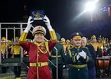 The Type 07, being the principal uniform of the PLA, is the official uniform of the band. The first unique uniform design for the band came with the Type 87 uniform, in which the band gained epaulettes among other things.[13] In early August 2014, the band debuted a new uniform for their new National Marching Band in front of visiting Uzbek President Islam Karimov,[14] a move which was praised by observers. The new uniform consists of white trousers and a white peaked cap as well as red closed collar overcoat. The uniform also had with a blue variant which drew comparisons with the United States Marine Corps and the Royal Marines.[15]