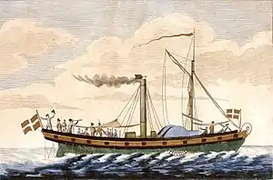 In May 1817 the Caledonia was bought by James Watt Jr (nephew of the inventor James Watt) and Matthew Robinson Boulton (son of Matthew Boulton). The new owners worked together as second generation of the engine factory of Boulton and Watt and they had plans to add ship engines to their production in Birmingham at Soho Manufactory. Watts and Boulton gradually replaced the machinery with their own products, and in order to test the endurance they took the Caledonia on a trip to Rotterdam and up the Rhine. The sidewheeler Defiance had gone as far as Cologne in June 1816,[6] and the Caledonia reached Koblenz in November 1817. It had, however, been necessary to use draft horses on the final part, and when the owners asked the Kingdom of Prussia for a concession for a regular service, their request was refused.[7] Caledonia spent the winter at Rotterdam, and more machine parts were delivered from England for installation. In the spring of 1818, the sidewheeler was back on the Thames, and James Watt Junior continued his experiments, among other things varying the number of paddles on each wheel. While this was happening, the Danish solicitor, and later diplomat, Steen Andersen Bille (1781-1860), had petitioned the Danish King for the exclusive concession for a steamship connection between Copenhagen and Kiel in Holstein (then a part of the Danish Monarchy). There were two other applicants for the concession, but both withdrew, and in October 1818 Bille's concession was confirmed. He wanted to buy the Caledonia, but at the time he worked as an administrator in the Danish West Indies, so the bankers Hambro and Son in Copenhagen (later Hambros Bank in London) took care of the purchase. Steen Bille's brother, the naval officer Michael Bille travelled to England, where he took over the Caledonia and led the ship to Denmark by the Eider Canal.[8]