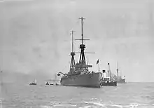 HMS Invincible anchored at Spithead, with on her port broadside the passenger paddle steamer Duchess of Fife