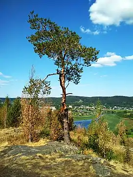 The Tohmajoki river (pictured) flows under the mountain, as well as the Karmalanjärvi lake stretch.[4]