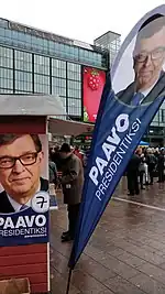 - ↑ "Keskustan jäsen Paavo Väyrynen sai kasaan presidenttiehdokkuuteen vaadittavat 20 000 kannattajakorttia – Vanhanen: "Hän on kilpailevan puolueen ehdokas"" (in Finnish). Helsingin Sanomat. 5 December 2017. Retrieved 30 December 2017.