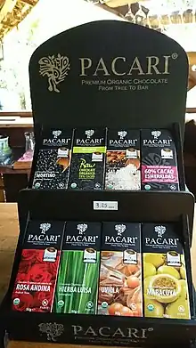 Pacari Chocolate is a chocolate company operating out of Quito, Ecuador.[1] Pacari Chocolate was founded as a family business in 2002 by Santiago Peralta and Carla Barbotó, who own and operate the company.[2] The company name 'Pacari' comes from the Quechua word meaning 'nature'. The chocolate is stated to be dairy, soy, chemical, transgenic and gluten free.[3]