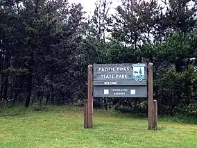Pacific Pines State Park is a 10-acre (4.0 ha) Washington state park on the Long Beach Peninsula, just north of Ocean Park. From the main parking area, there is a narrow, sandy footpath that leads through a grove of Pacific Ponderosa pine trees to the beach. The park offers picnicking, beachcombing, fishing, clamming, and crabbing.[2]