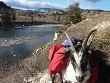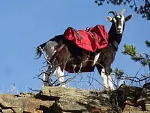 A pack goat is a goat used as a beast of burden, for packing cargo. Generally, large wether (castrated buck) goats are used for packing, though does may also be packed.[1] While does are generally smaller and therefore able to carry somewhat less cargo,[1] they may also provide fresh milk.