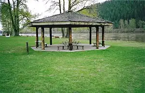 The park has a seating area and plaque that explains its history, but due to its location in a low-lying area by the Fraser River, it has been prone to flooding, especially during spring run-off.