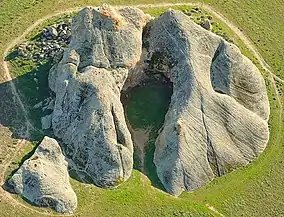 Painted Rock is a smooth horseshoe-shaped marine sandstone rock formation with pictograph rock art about 250 feet across and 45 feet tall near Soda Lake within the Carrizo Plain National Monument[1] on the southwest side of the northern Carrizo Plain, west of Bakersfield and about 70 miles (110 km) east of San Luis Obispo and 45 miles (72 km) west of Taft, in California, United States.