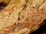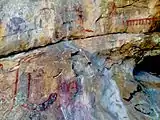 The interior of the rock alcove is adorned with many pictographs created by the Chumash, Salinan and Yokuts peoples over many thousands of years. In recent times there have been many marks left by early White settlers such as one reading "Geo. Lewis 1908", founder of Atascadero, California. Unfortunately there has also been major defacing of this site; in the 1920s the large pictogram was irreparably damaged by a shotgun blast.