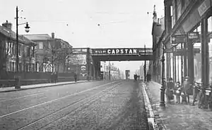 As can be seen on the linked map,[1] it was situated on the north side of Glasgow Road on the site of what became the Kelburn cinema, now the Kelburn Retirement Flats near the Sherwood Church. From the station to Seedhill Road, the line ran down Lacy Street along a very high wall. The station was first turned into a garage [2] then demolished in 1928.[3][4] However, the branch continued into Paisley East goods at Cecil Street crossing Lacy Street at street level.[5][6][7] The branch from Blackbyres junction to Paisley East goods closed on 31 December 1960.[8]