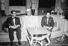 Captains Abdul Kardar (left) and Lala Amarnath (right) with Indian President Rajendra Prasad (center) on the day of the first test, 16 October 1952
