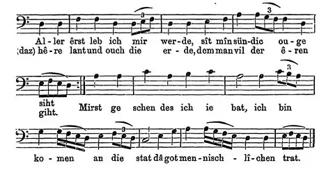 The earliest source for the melody is the Münster fragment (ms. Z), written about a century after Walther's death.[5] The Carmina Burana ms. (c. 1230) contains the first stanza of Palästinalied (CB 211a) with neumes, which are however insufficient for reconstructing a melody. The stanza is given as an appendix to Alte clamat Epicurus (CB 211), which was to be sung in the same melody.