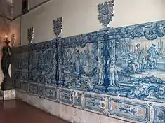 The interior is distinguished for its 18th-century azulejo panels representing gallant scenes, flanked by accented tiles forming divisions as pilasters and surmounted by vases.[2] A marble staircase, covered in vaulted ceiling includes decoration in relief stuccos. Similarly, there are two other triangular azulejo panels depicting Saint Francis of Assisi and Saint Martial.[2]