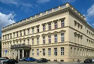 The Palais am Festungsgraben (“Palace on the Moat”), originally known as the Palais Donner, is a stately building in Berlin’s Mitte subdistrict located behind, and facing, the ensemble of chestnut trees around the Neue Wache (“New Guardhause”), near the eastern terminus of the boulevard Unter den Linden. The name refers to its construction next to a redundant canal, gradually filled in by 1883, which had originally been a moat surrounding the 17th century city wall. Built as a private residence, it later housed a succession of Prussian government offices, and after World War II various cultural institutions in the Soviet sector of Berlin. After administrative authority was transferred to the newly established German Democratic Republic (GDR) in 1949 it hosted a succession of institutions established to further German-Russian contacts. Since German reunification it has accommodated a theater (Theater im Palais) and from 2004 an art gallery (Saarländische Galerie – Europäisches Kunstforum e.V.).[1]