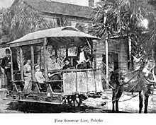 The Palatka and Heights Street Railway was a streetcar system in Palatka, Florida, chartered in March 1888 with a 50-year franchise. It opened in January 1889, with three miles of 3 ft (914 mm) narrow gauge track. In 1904 it is shown as owning two cars and two horses, though common practice in the South was to use mules rather than horses, and pictures in the Florida State Archives show the P&HSRy car pulled by mules.[1]