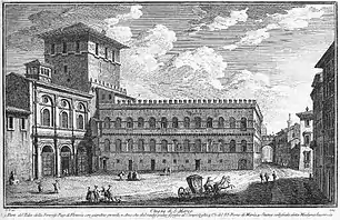 In 1564, Pope Pius IV assigned part of Palazzo San Marco (including the Palazzetto) to the Republic of Venice, and the building became its diplomatic seat.[3] During the earthquake of 5 October 1651, a large portion of the facade overlooking Piazza San Marco collapsed; the structure was shored up, but the damage was extensive. The building was partially restored and secured by the architect Orazio Torriani.[3] In 1770, the closing of the arches was completed at the request of the Venetian ambassador Nicolò Erizzo, who used the resulting closed space as a single room distributed on two levels.[4]