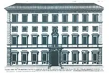 Giacomo Della Porta worked on the construction of the building by acting on the load-bearing structures and internal partitions from last years of 1500 until his death in 1602, after which Girolamo Rainaldi, who from 1592 collaborated with the Maestro.,[1] inherited the task of redoing and realign the facade of the building with the new layout of the square.[2] This creates the millimeter perspective obtained from the entrance door of the Palazzetto through the orthogonality of the entrance gallery with the facade of the palace overlying to the existing buildings already present at least since 1593 as the cartography of the time shows.[3] The integration of the two buildings is allowed by the position of the openings of the rear part of the Palazzo Grande, which are aligned with those of the Palazzetto behind and not modified by the façade works started in 1603. As can be seen from the licenses obtained by the owners respectively 1603 and 1616, the first to redo the aforementioned façade of the palace on Piazza Campitelli,[4] the second to build the overpass connecting the two properties,[5] these did not provide for other demolition and reconstruction works of the structures. Even the hanging garden is aligned with the flyover doors both towards the first floor landing of the Palazzo Grande and towards the first floor of the Palazzetto. The façade and the external decorations of the Palazzo Grande are by Rainaldi with an exquisitely manneristic invention, while the immediate inheritance received by Della Porta provided for the general form of the compact and traditional construction[6] and generates the orthogonality of the internal entrance gallery. The subsequent construction of the overpass completes the integrative intentions derived from the astounding perspective of the Palazzetto, giving life over time, to an architectural masterpiece that could only emerge so perfect in the execution of the execution by the collaboration of two geniuses.