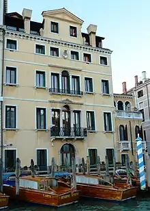 The palace was initially erected in the 14th century, but underwent a near complete reconstruction in 1956 under Angelo Scattolin. The ground floor has a portal opening to the canal.[1][2]