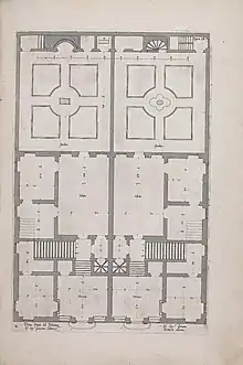 The cousins Lazzaro and Giacomo Spinola (from Luccoli) had the palace built between 1583 and 1588. The attribution of two distinct house numbers is due to the fact that the palace, although it consists of a single building, is made up of two distinct and symmetrical dwellings, a feature that makes it unique among the palaces of Strada Nuova. The absolute symmetry conceived by the unknown architect who oversaw its construction characterises both the facades, the floor plan and the gardens, as can be seen in the surveys made by Rubens for the 1622 edition of the Palazzi di Genova.[1] The uniqueness of the double construction is still highlighted by the presence of the two identical portals facing the street.