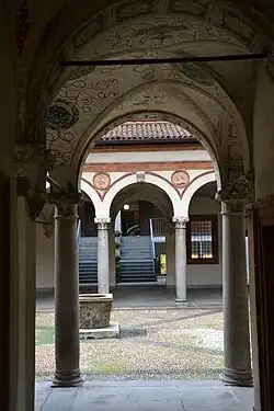 The courtyard is accessed through an entrance hall, which features the original Renaissance decoration consisting of frescoes covering the cross vaults, supported by carved corbels. The regular courtyard is opened by porticoes on the four sides of four arches each. The arches are supported by stone columns surmounted by composite capitals with acanthus leaves, which house horse-head plaques with coats of arms that are no longer legible. Above the arches runs a decoration of terracotta cornices and cords, restored to their surviving parts. Between the spandrels of the arches, a series of stone roundels alternates noble coats of arms with profiles of personages from the Sforza court.[3] In the centre, a sculpted well-curb, dating back to the 15th century.
