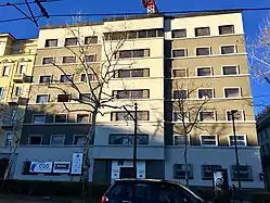 Pagano and Gino Levi-Montalcini (1902–74) built the Palazzo Gualino in 1928–29, with a flat roof rather than the sloped tile roof typical of other buildings in the city.[3] In other ways the Rationalist design carefully combined modern and traditional features.[4] The building has a symmetrical facade with seven floors on the main front on the Corso Vittorio Emanuele, and five floors on the Via della Rocca.[2] The identical low-stacked floors and the unorthodox but functionally rational horizontal windows convey a sense of efficiency rather than power.[1]