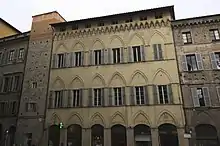 The three-story palace, notable for the acute arches around doors and windows, was built at the end of the 14th century. The northernmost arch is surmounted by the coat of arms of the Piccolomini (Cross with five crescents and a papal tiara). The interior has 16th-century monochrome frescoes attributed to Giovanni Battista di Jacomo del Capanna. The central courtyard has a well made with pietra serena. Refurbishment of the interiors were pursued in the 19th century in a Neoclassical-style by the architect Agostino Fantastici under commission from the Piccolomini-Clementini family. The piano nobile was frescoed (circa 1830-35) by Cesare Maffei[1] with Scenes from the Life of Achilles.[2]