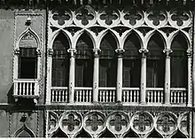 The façade of Palazzo Pisani Moretta is an example of Venetian Gothic floral style with its two floors of six-light mullioned windows with ogival arches, similar to those found in the loggia of the Doge's Palace flanked by two single windows. The ground floor has two central pointed arched doorways opening on to the canal.