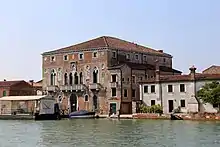 The Palazzo da Mula is a Venetian villa on the island of Murano in the Venice Lagoon, on the sub-island of San Pietro Martire, on the south bank of the Canale degli Angeli, near the Ponte Vivarini bridge that leads to the main island of Murano, San Donato. The palazzo is the last remnant of Venetian villas built in Murano in the 15th and 16th centuries. Originally there were only a few villas with extensive gardens on the island, but today the Palazzo da Mula is integrated into a row of houses.[1] The 16th and 17th-century structure and details of the palazzo can be traced back to the Da Mula family, who had acquired the palazzo from the aristocratic Diedo family in 1621. The Da Mulas resided in this palazzo until 1712, when it was rented to the aristocratic family of Giacomo Fontanella, a member of the new aristocracy of glass masters, for a sum of 110 ducats. The property then passed to Giacomo's son, Zuanne Fontanella.