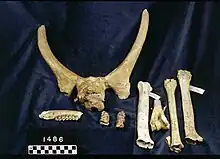 The earliest evidence of human occupation in Oregon comes from human coprolites in Paisley Caves dated to 14,300 years ago.[48] Other early sites include an encampment near Bandon dated to around 10,000 years ago and a pair of sandals from Fort Rock Cave dated to around 9,000 years ago.[2] The margin of error for these dates makes it possible that humans contributed to the extinction of Oregon's Pleistocene megafauna.[49]