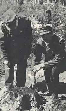 At the glade the prisoners' bags were taken but they were permitted to keep their documents and small belongings. Jews left on the yellow Star of David they were forced to wear as a badge under Nazi occupation; and people who worked in Pawiak's infirmary were found still wearing their badges with the Red Cross symbol. Sometimes prisoners' hands were tied and their eyes blindfolded. The victims were then taken to the edge of the grave and executed by machine gun fire. Sometimes victims were forced to hold a long pole or ladder behind their back. Such supports were later lowered so that the bodies fell into the grave in an even layer. Postwar exhumation proved that the wounded victims were sometimes buried alive.[13][16] SS and OrPo members photographed the executions until it was forbidden by the SS-Standartenführer Meisinger, as happened on 3 May 1940.[17] After the execution was finished, the graves were filled in, covered with moss and needles, and then planted over with young pine trees. Families of the victims were later informed by the Nazi authorities that their relatives had "died from natural causes".[12][18]