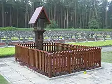 In 1948 the forest glade near Palmiry was transformed into a war cemetery and a mausoleum.[52] Victims of Nazi terror whose bodies were found in some other places of execution within the so-called "Warsaw Death Ring"[lower-alpha 5] were also buried in the Palmiry cemetery. Altogether, approximately 2204 people are buried there.[53] In 1973, the Palmiry National Memorial Museum, a branch of the Museum of Warsaw, was created in Palmiry.[52]