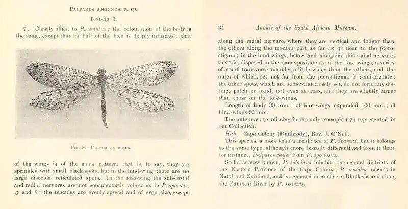 The original scientific description of Palpares sobrinus by Louis Péringuey.[1]