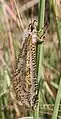Palpares sobrinus is a relatively large antlion; wing length is about 5 cm. The very broad wings are mottled dark brown. Males have long appendages at the end of the abdomen.