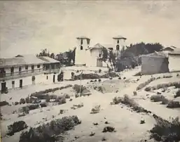 The temple of Pampas was built near a rock, possibly a huanca (monolith). Near the church, on a slightly sloping ground, the main square, the main streets and the stables were laid out, thus forming a checkerboard development. The buildings surrounding the plaza mayor were built and occupied by the first native families to arrive from Huamancalla and Canchón. The Spanish members of the clergy and of the viceregal institutions settled in the cloister of the temple, while the viceregal institutions such as the council, the school and the prison were built in the square.[35]
