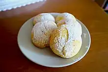 The second describes Pan Meino as the accompaniment to the cups of cream once offered by milkmen on the day of St. George, their patron, April 23, the day on which Pan Meino is traditionally prepared currently.[1][2] The recipe for Pan Meino calls for flour mixed with eggs, milk, cream, butter, sugar and elderflower. The mixture is given a flattened circular shape to then move on to baking.[3][4]