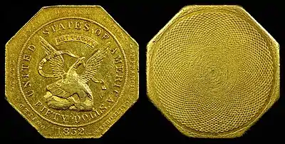 All of these $50 pieces, public or private, are very rare and valuable today: One of Humbert's octagonal pieces, dated 1851 and with a lettered edge, sold at auction in 2010 for $546,250.[2] The only $50 piece produced by the United States Bureau of the Mint prior to 1915 was the 1877 pattern half union, produced experimentally at the Philadelphia Mint, though it was not approved as a circulating coin.[3]