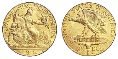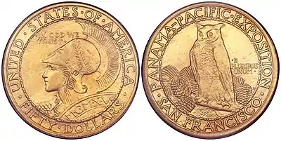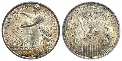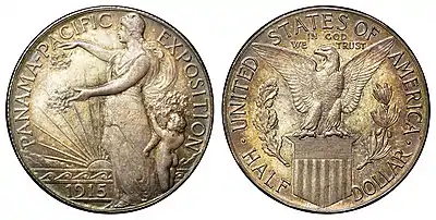 Art historian Cornelius Vermeule deemed the obverse of the half dollar "a halfway point between the designs on French silver pieces early in the new century and A. A. Weinman's 'Walking Liberty' for the half dollar".[32] The fifty-cent piece bears the motto "In God We Trust", as do the $50 pieces, the first commemorative coins to display it.[33] That motto was first used on U.S. coins in 1864. In the 19th century, it was not mandatory that the motto be used, but it nevertheless appeared on most denominations of U.S. coins by the turn of the 20th century.[34] In 1907 and 1908, there had been many objections to the motto's omission on the gold ten dollar and twenty dollar pieces designed by Augustus Saint-Gaudens. In response to the public outcry, Congress in 1908 passed legislation requiring its presence on any circulating coin which had previously borne it, as both gold pieces had until 1907. The wording on the Panama–Pacific pieces was left to the discretion of the Secretary of the Treasury, but officials may have remembered the fracas. Swiatek and Breen suggested that those involved in creating or approving the design may have moved to head off controversy.[33]