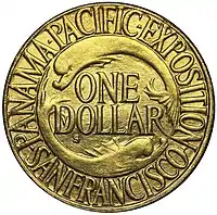 Vermeule called Keck's dollar "a novel, daring use of the limited area afforded by such a small, thin coin. Compared with the earlier gold dollars, the coin is a work of art."[40] Numismatist Arlie Slabaugh, in his volume on commemoratives, noted that the Panama–Pacific dollar "presents a bold American design, completely different from the classical styles used on the other denominations".[43]