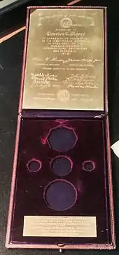 Several proposals for commemorative coins had been introduced by mid-1914, though none had been issued by the Mint since 1905. One, sponsored by New York Senator Elihu Root, called for a commemorative quarter dollar marking a century of peace, as well as the August 1914 opening of the Panama Canal.[12] Two bills were introduced calling for coins to commemorate and benefit the Panama–Pacific Exposition; H.R. 16902 was introduced by California Congressman Julius Kahn on June 3, 1914.[13] Senate bill (S.) 6309 was introduced in that body by New Jersey Senator James E. Martine on July 6. This bill called for two $50 pieces (one round, one octagonal), a quarter eagle or $2.50 in gold, a commemorative gold dollar, and a half dollar.[14] The octagonal pieces were intended to recall the unofficial $50 coins struck during the Gold Rush[15]