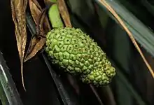 Female plants produce round, compound fruit about 10–20 cm in diameter made up of merged drupes,[5] resembling a pineapple. These turn from green to a bright reddish-orange when mature and are eaten by many animals including elephants, monitor lizards, rodents, bats and crustaceans. The timber is resistant to termites.[6]