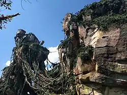 A major visual feature of Pandora is the Valley of Mo'ara and its floating mountain ranges. The 156 foot (48 m)-tall mountains employ forced perspective to appear larger than they physically are, and are held aloft by steel beams concealed with rockwork and vinery.[39] Designers were sent to Zhangjiajie National Forest Park to study the jagged pillar peaks of the Wulingyuan region for inspiration, as well as foliage studies in Hawaii.[19] The steel foundations for the floating mountains required a year to complete.[19] Pandora's bioluminescent species of flora are also found throughout the area.[7][8][9] Imagineers created twenty species of Pandoran flora exclusively for the land.[40] The landscaping consists of real Earth plant species mixed with sculpted Pandora flora, with each alien plant requiring its own concealed control box to create the necessary amount of illumination in bioluminesce during the evening hours.[41][19] New motion sensor technology developed by Disney Research, allows the plant life to respond to tactile interaction from guests.[42] Audio recordings of Pandoran animals create ambient noise throughout the land.[34]