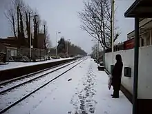 The summer image at top right of the page shows the station before the big trees at the Dunlopillo factory (on the left in that image) were pruned back to the trunks.[7] At that time, in early mornings in spring, you could watch buzzards trying to rob the rooks' nests. Since the trees were pruned (on the left in the snowy image) the buzzards have stopped coming, but in spring you can still watch jackdaws attempting to nest in the chimneys of the old station house (now the Co-op). The once rare and threatened red kites can now regularly be seen riding on the thermals above the station. During summer, house martins were to be seen before the industrial estate was demolished, and swifts used to scream over the station. Goldfinches and bullfinches used to graze on the weed-seeds between the station and Dunlopillo car-park, but are no longer to be seen due to mowing of this area. Blackbirds are regularly heard in the few remaining trees.
