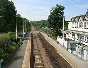 There are just the two platforms, the up line (platform 1) to Leeds and the down line (platform 2) to Harrogate with bus type waiting shelters. Digital information screens are in place on each platform and an automated public address system is also installed to offer train running information. Both platforms have access ramps from the main road for use by disabled passengers.[2]