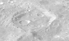 This is a worn and eroded crater, although the perimeter of the rim is still visible. The southern part of the interior floor is jumbled and irregular. There is a small crater next to the inner wall along the west-southwest part of the floor. A smaller crater also lies in the interior along the northeast inner wall. There are also several small craterlets on the floor.