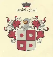 The coat of arms The house of Bettoni of Venice,[3] already allied to the family of Ostia Fè in 1852,[4] is a quartered shield of silver and red with four roses neighborhoods one by the other, (two silver roses and two red roses.