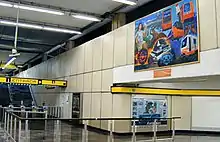 There is a cultural display, an Internet café, a women's defense module, and a health module all inside the station.[3] Outside the station, a public ministry office was installed in 2002 to reduce criminal offenses inside the station.[35] On 1 May 2007, the system inaugurated the mural Alegoría a la Ciudad de México y el Sistema de Transporte Colectivo (lit. transl. Allegory to Mexico City and the Collective Transport System), painted by José Luis Elías Jáuregui. According to him, he was inspired by the history of the country and decided to include multiple elements that represent it, including the Popocatépetl and Iztaccíhuatl volcanoes, an eagle devouring a snake (a reference to the country's coat of arms), a pyramid, and a Mestiza holding a white dove. The acrylic-on-canvas artwork is 9 m (30 ft) wide and it honors the STC workers and it features four train models used by the system.[36][37] In 2014, the Government of Mexico City built a bicycle parking station near the CETRAM.[38]