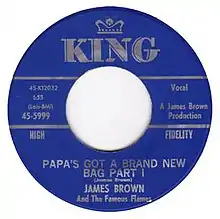 "Papa's Got a Brand New Bag" is a song written and recorded by James Brown.[2] Released as a two-part single in 1965, it was Brown's first song to reach the Billboard Hot 100 Top Ten, peaking at number eight, and was a number-one R&B hit, topping the charts for eight weeks.[3][4] It won Brown his first Grammy Award, for Best Rhythm & Blues Recording.[5]